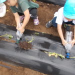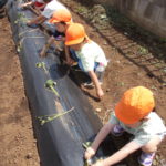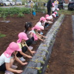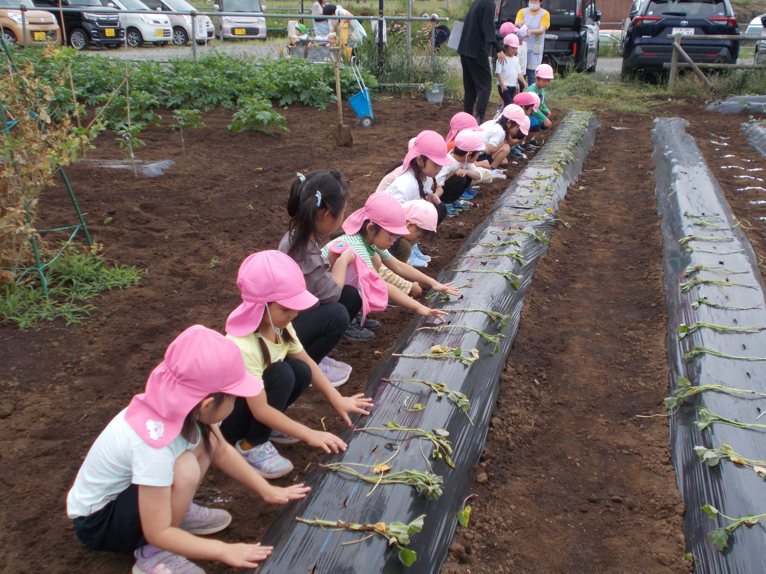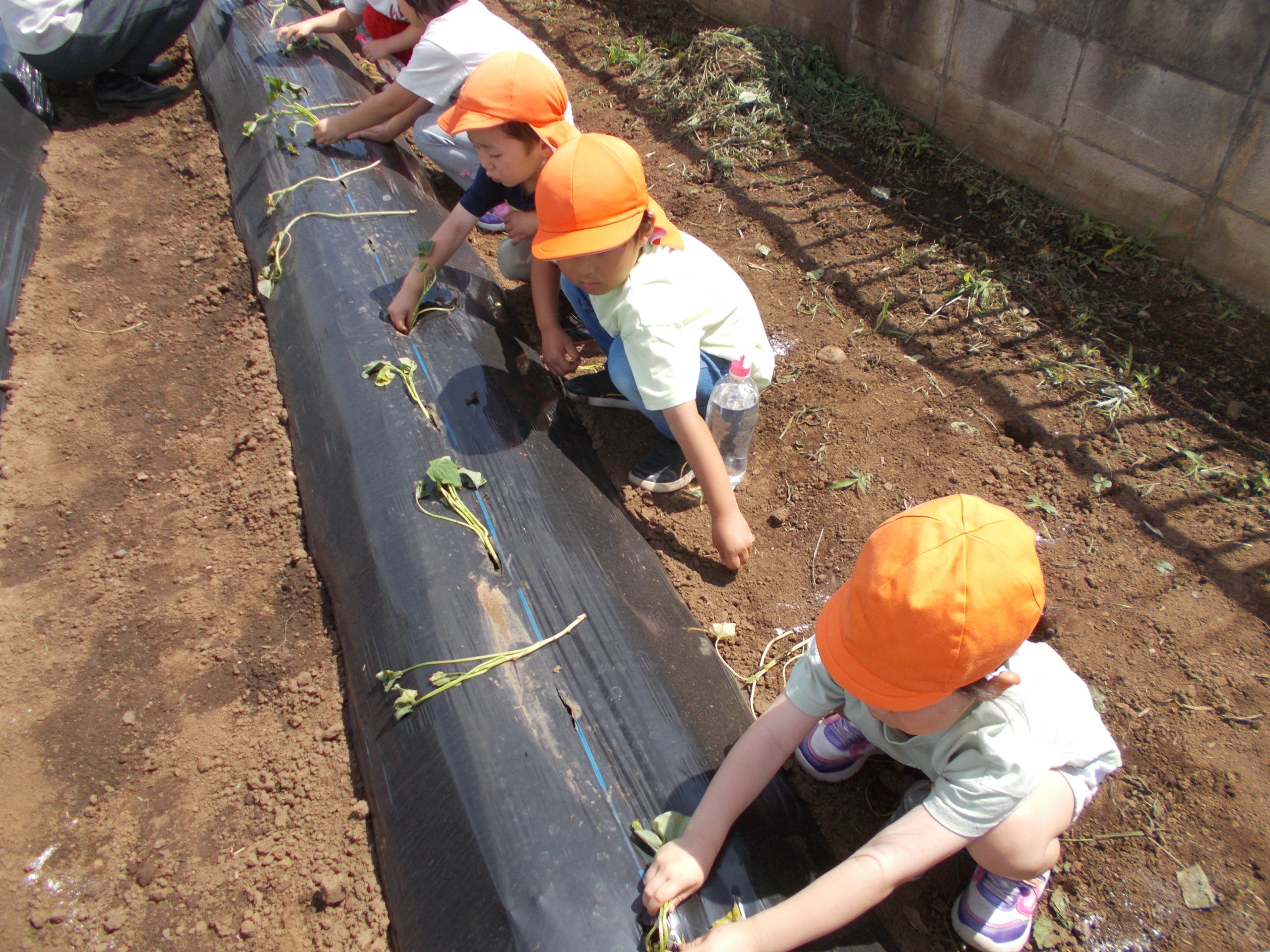 昨日、今日は幼児組さんが秋に収穫するさつま芋の苗を植えました。 保育園の駐車場横の畑は今たくさんの野菜が育っています。