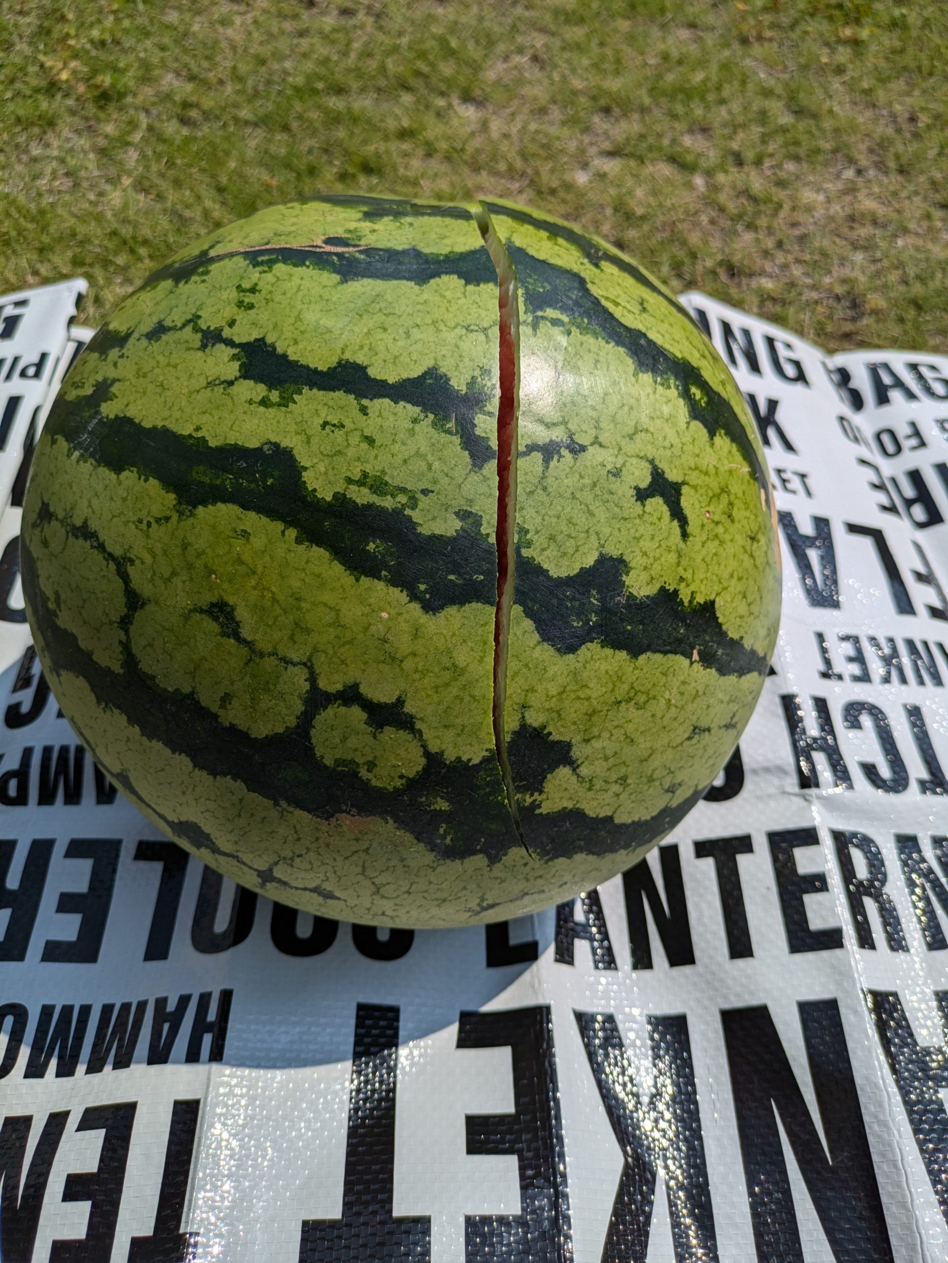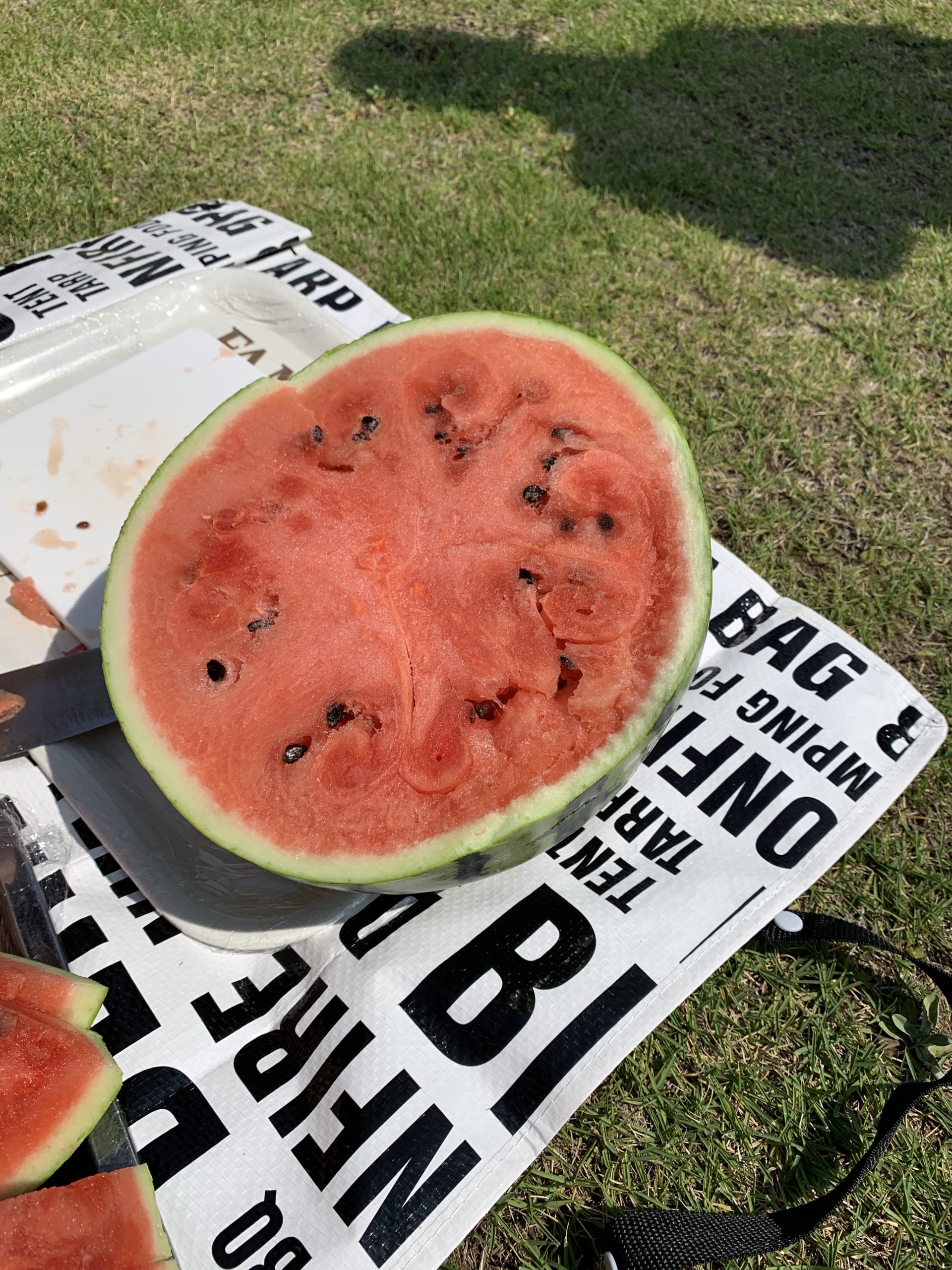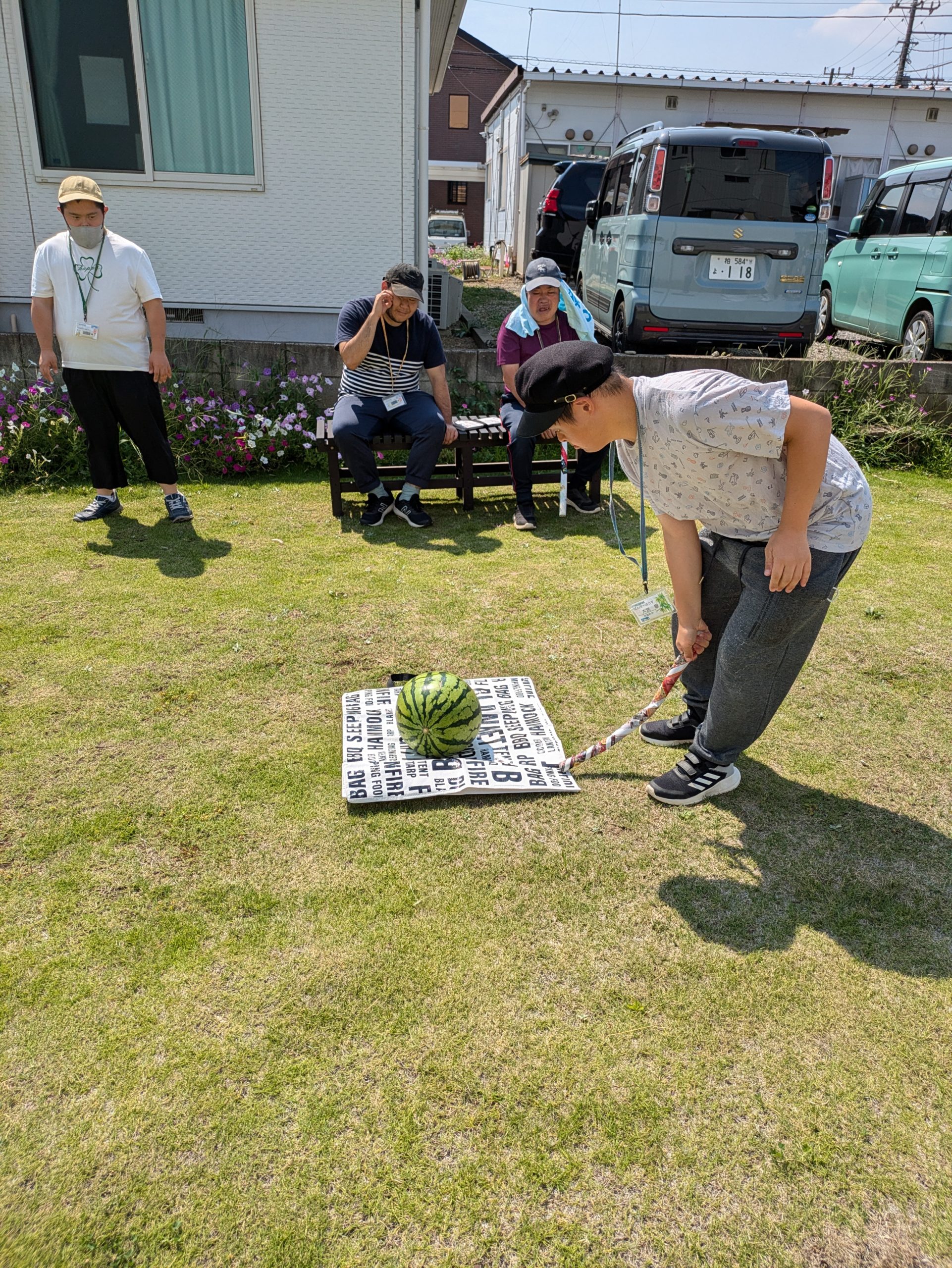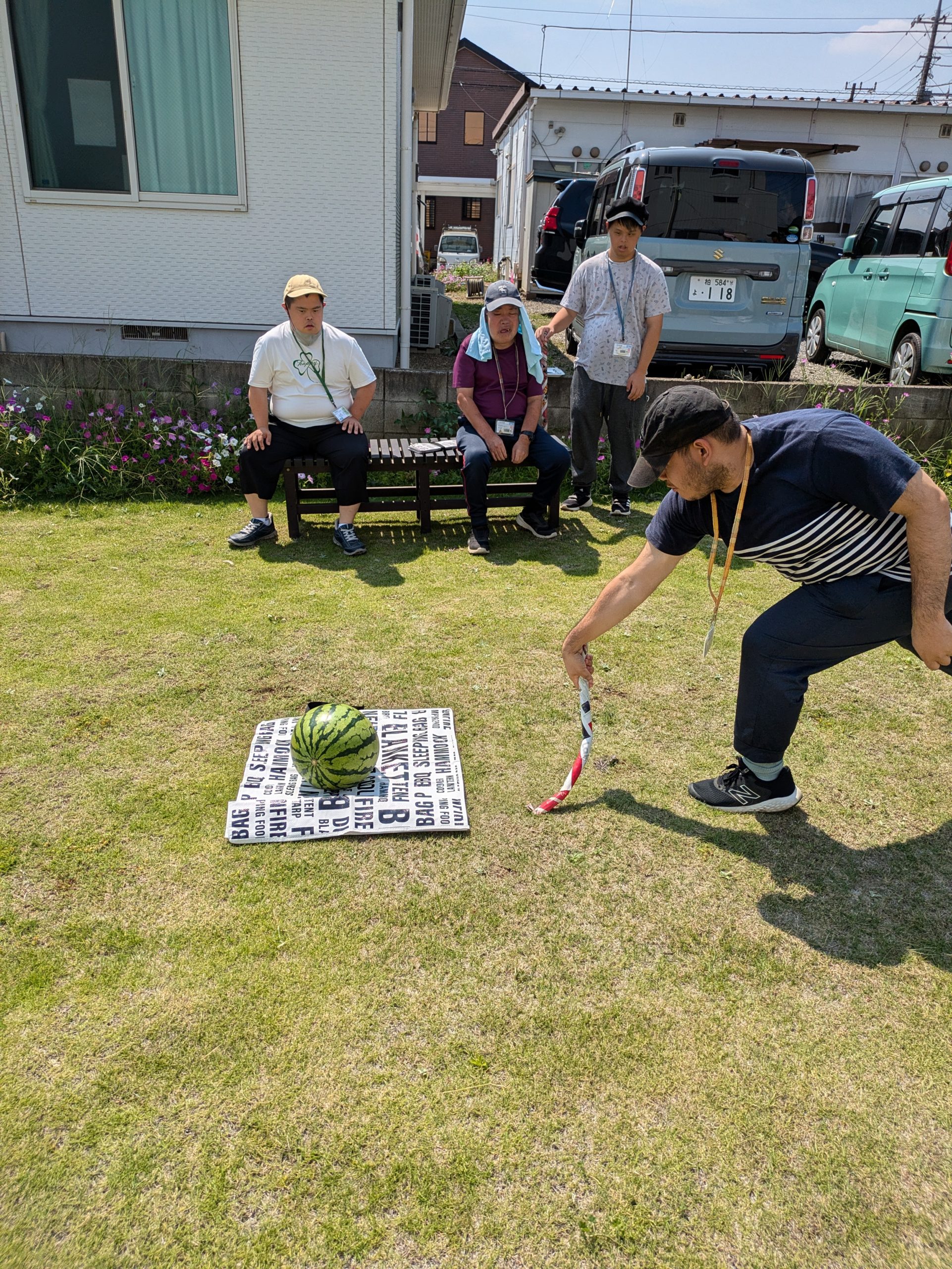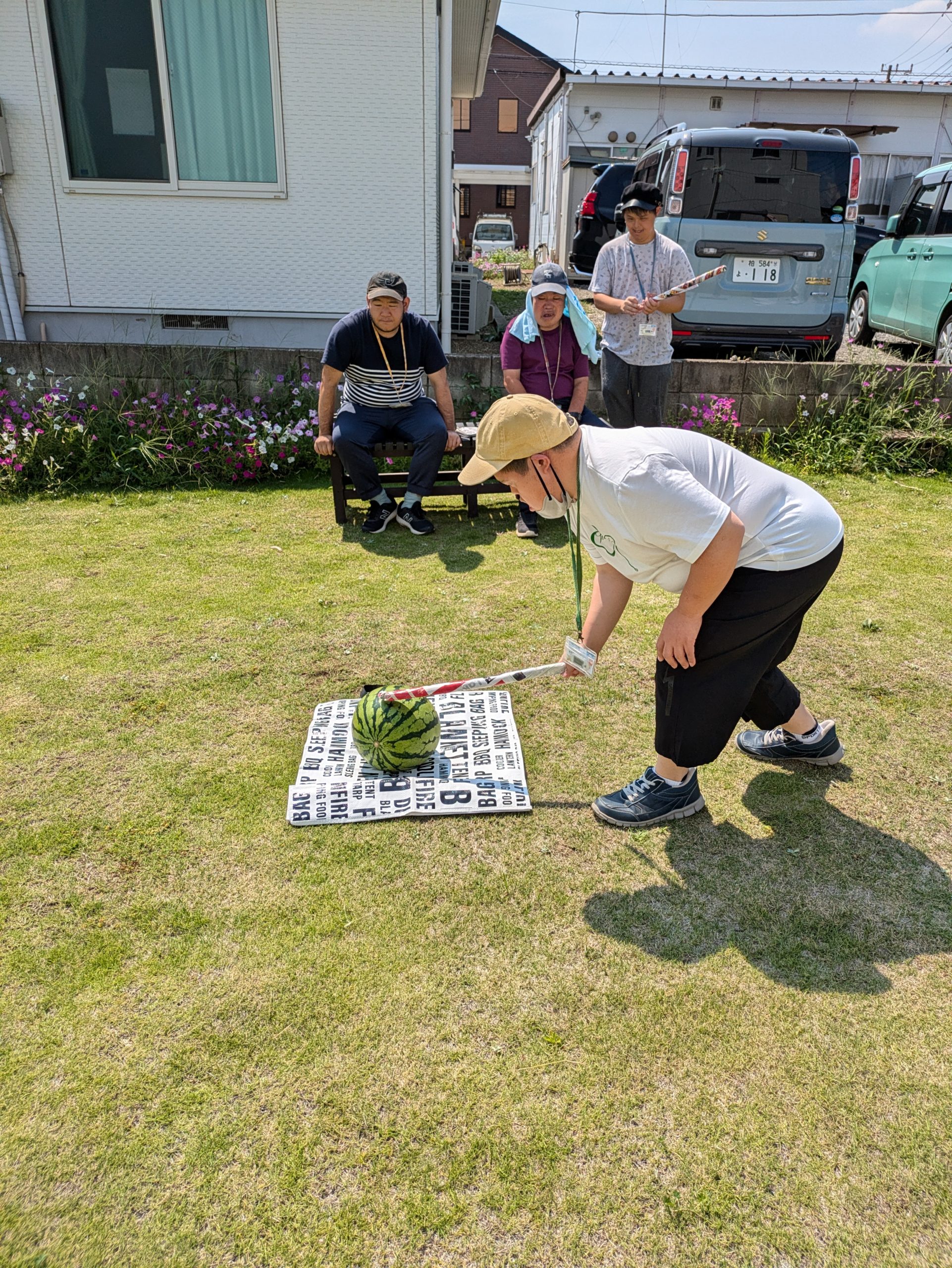 スイカ🍉割りと言ってもぐちゃぐちゃになってしまわないように😁新聞紙を丸めたもので順番に・・・
