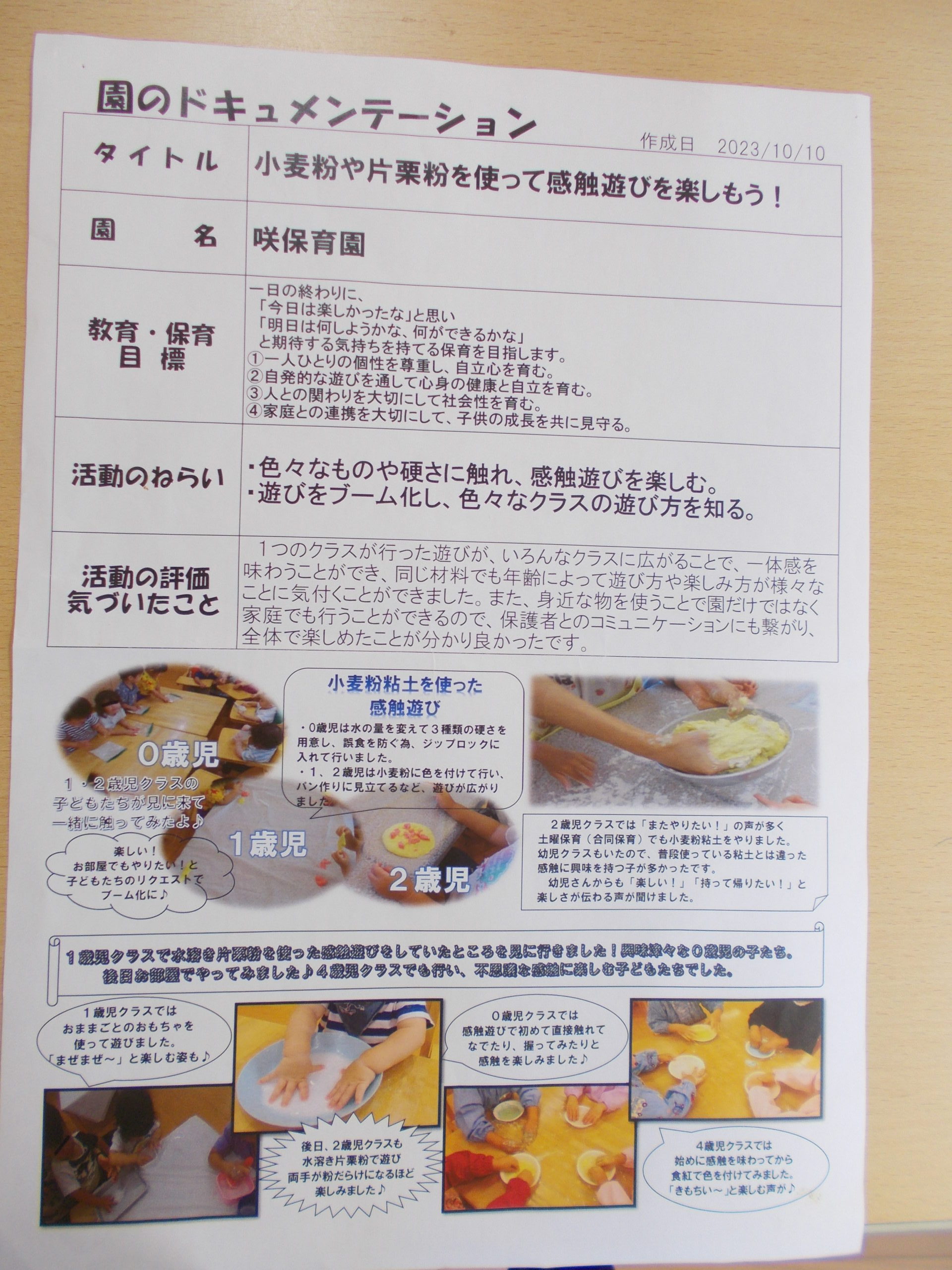 咲保育園は小麦粉と片栗粉の触感遊びをテーマにした活動報告をしました。