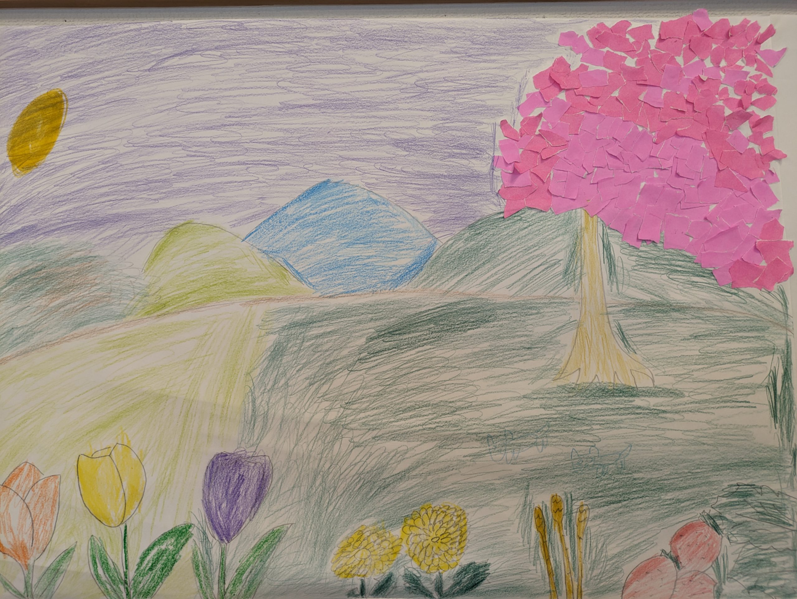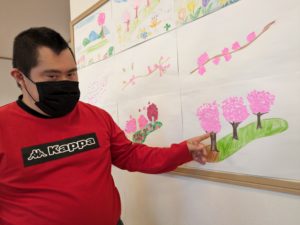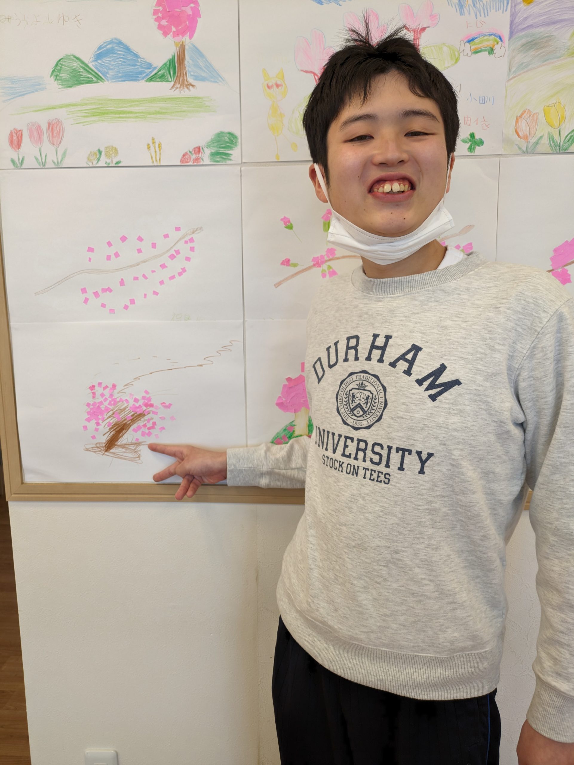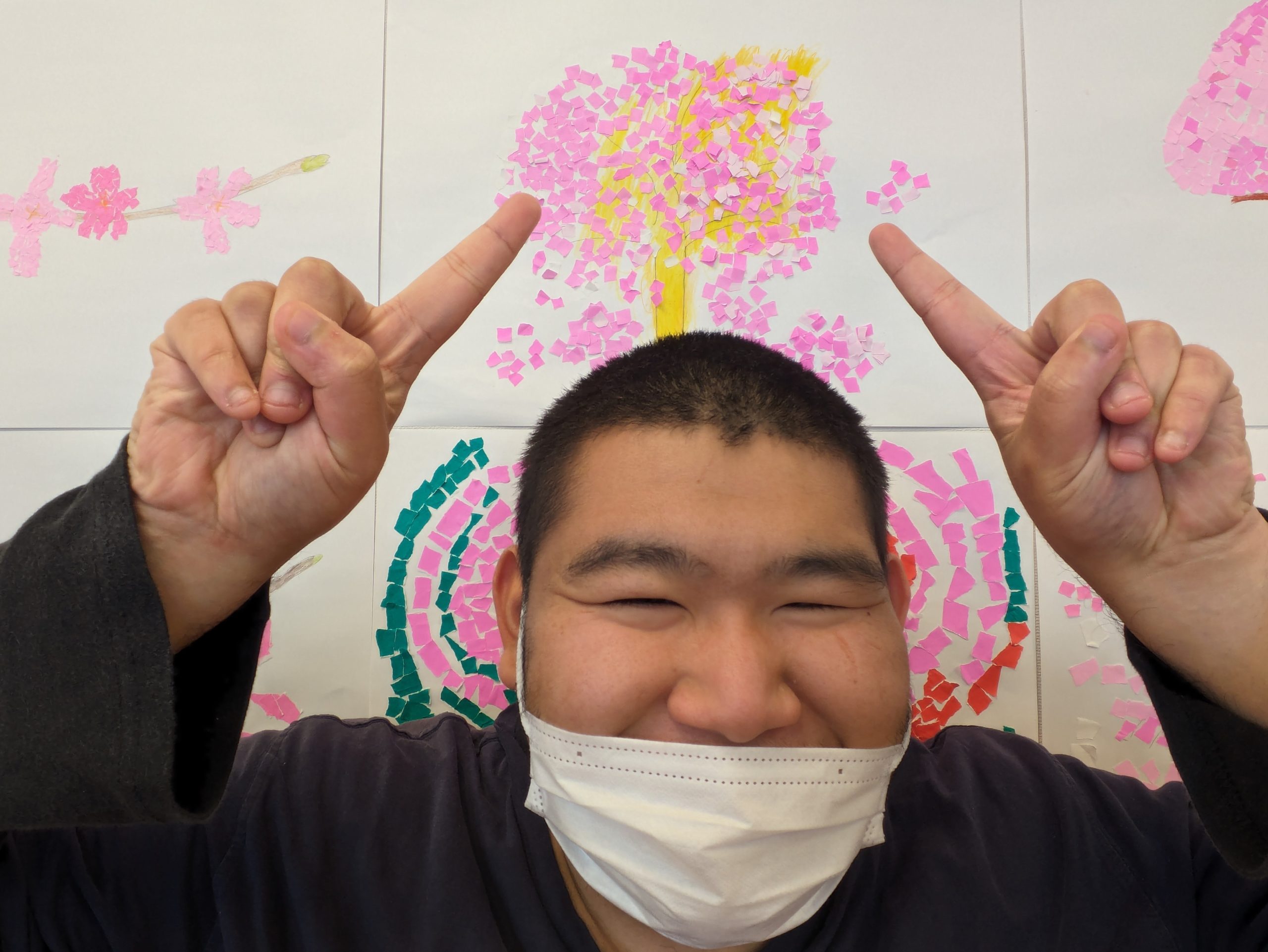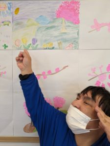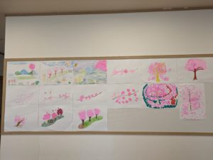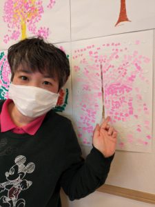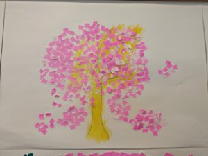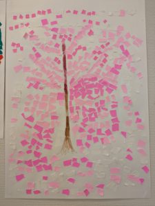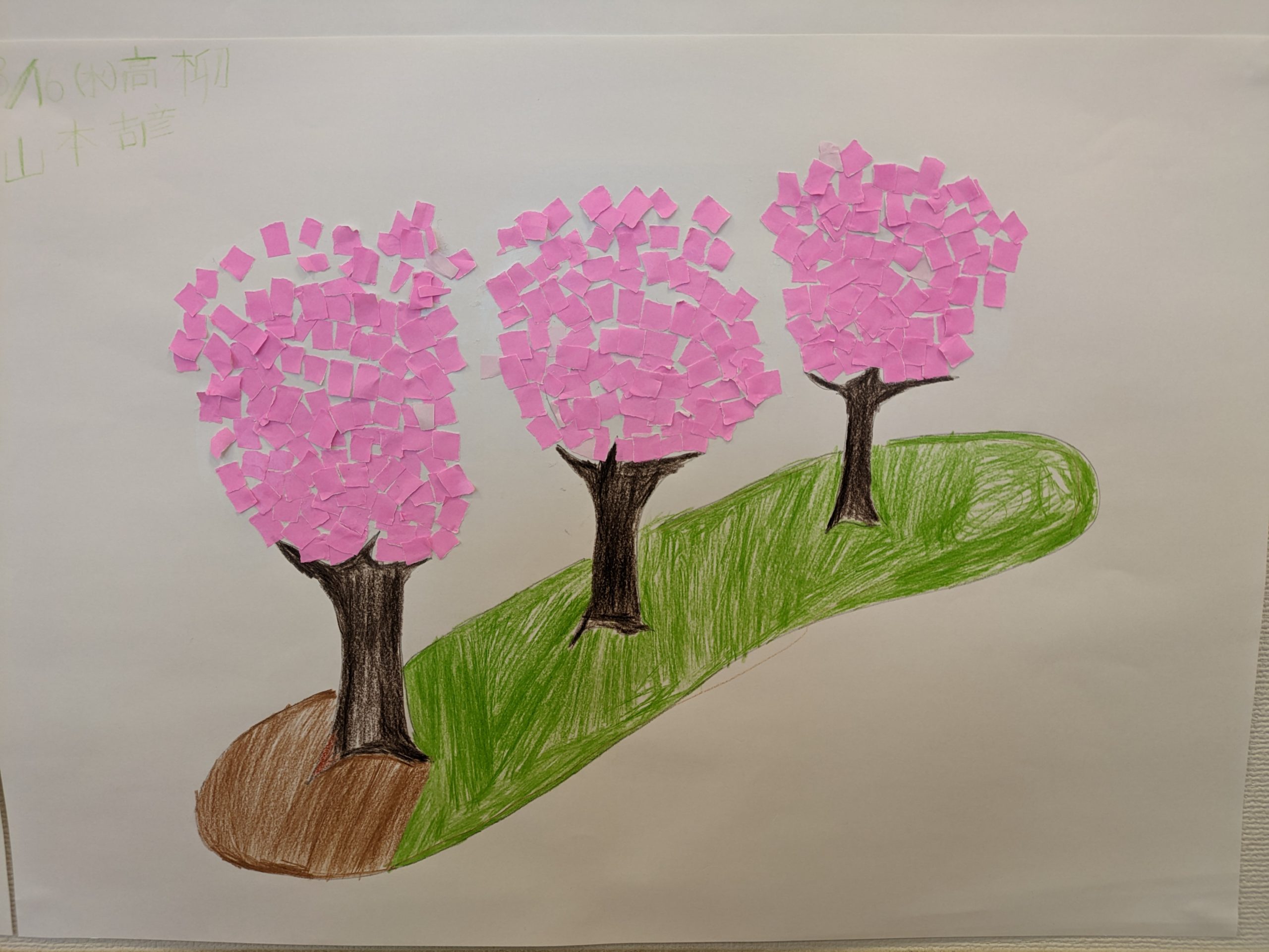 5種類の桜の絵の中から好きな物を選び、画用紙に自由に折り紙をちぎって貼っていきました。